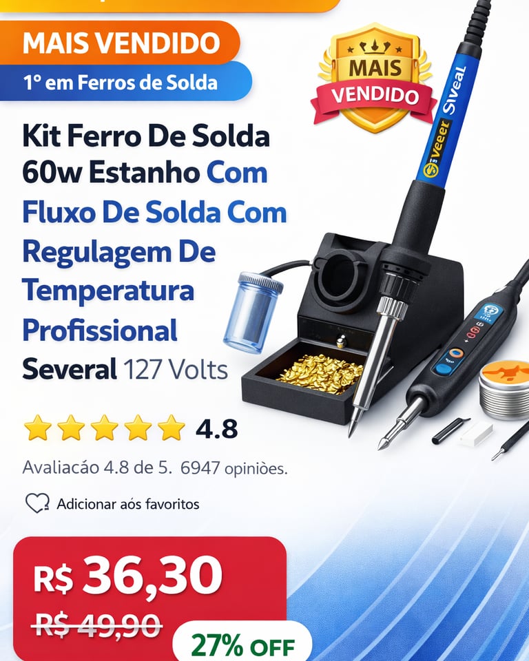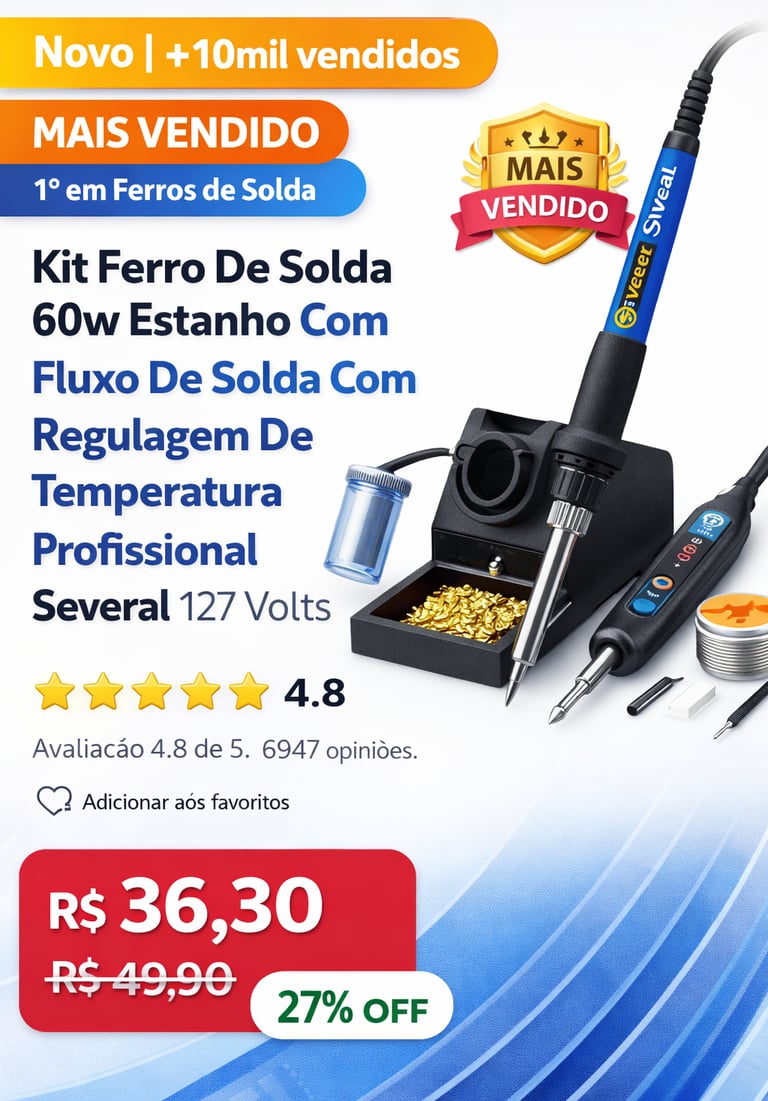 Descubra o kit ferro de solda 60W com estanho e fluxo, ideal para profissionais e hobbystas. Com regulagem de temperatura e excelente custo-benefício, é um dos mais vendidos no Brasil, com avaliação média de 4,8 estrelas e mais de 10 mil unidades vendidas. Saiba se vale a pena comprar!